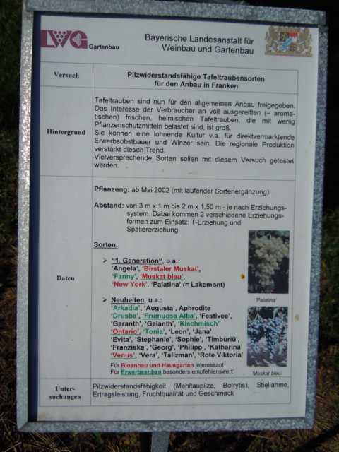 Man kann es lesen und da es öffentlich aushängt, wird ein Foto wohl keine Urheberrechtsprobleme verursachen.Der Tafeltraubentag ist ein schöner Spaziergang und mal Trauben statt Fotos davon gucken. Die intensiv gepflegten Anlagen mit fachkundigem Pflanzenschutz, Tröpfchenbewässerung und optimierten Anbausystemen incl. Bodenuntersuchung und angepasster Düngung mögen für kommerzielle Tafeltraubenproduzenten nett sein, aber kaum für Eigenbedarf-Hobbyisten.Dort müssen sich die Reben oft mit weit ungünstigeren Bedingungen herumschlagen. Viele taugliche Pflanzenschutzmittel gibts nur mit Sachkundenachweis, z.B. 20 stündigen Sachkundekurs oder eine Ausbildung als Landwirtschaftlicher Facharbeiter mit Auffrischungskursen. Hätt ich Klima, Bewässerung, Pflege, Platz, Ertragssicherheitserwartungen wie bei denen...