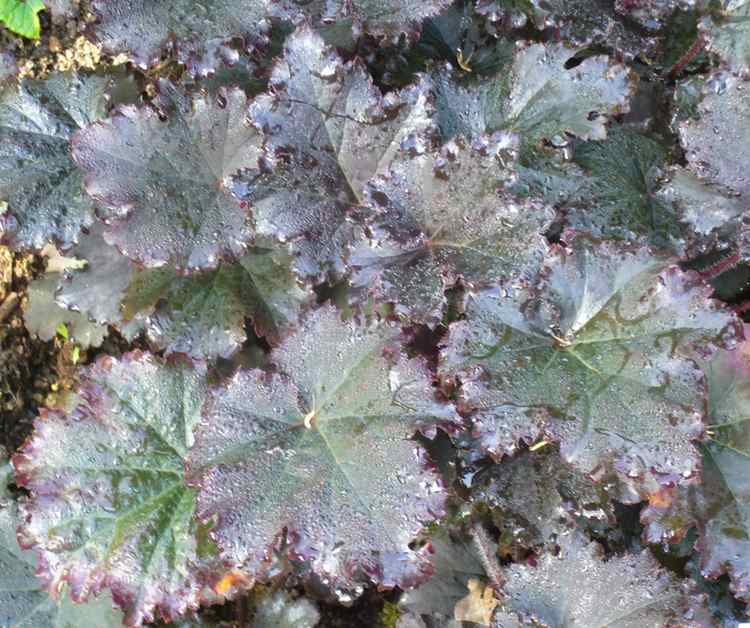 Herrliches Spätsommerwetter, da macht ein Morgenspaziergang durch den Garten richtig Spaß.Heuchera "Binoche", eigentlich fast schwarz, im Morgentau...