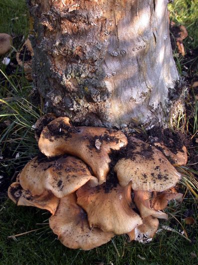 und eine ganze Kolonie sich fletzender Riesenpilze am Fuß eines toten Baumstumpfs in voller Sonne. Leider sind sie mit Erde bestreut. weil auf dem Baumstumpf eine Kübel mit Kapuzinern stand, in dem derzeit die Amseln mächtig rumpicken und alles rausschmeißen, wahrscheinlich auf der Suche nach irgendwelchen Larven. Oder fressen die Kapuzinersamen