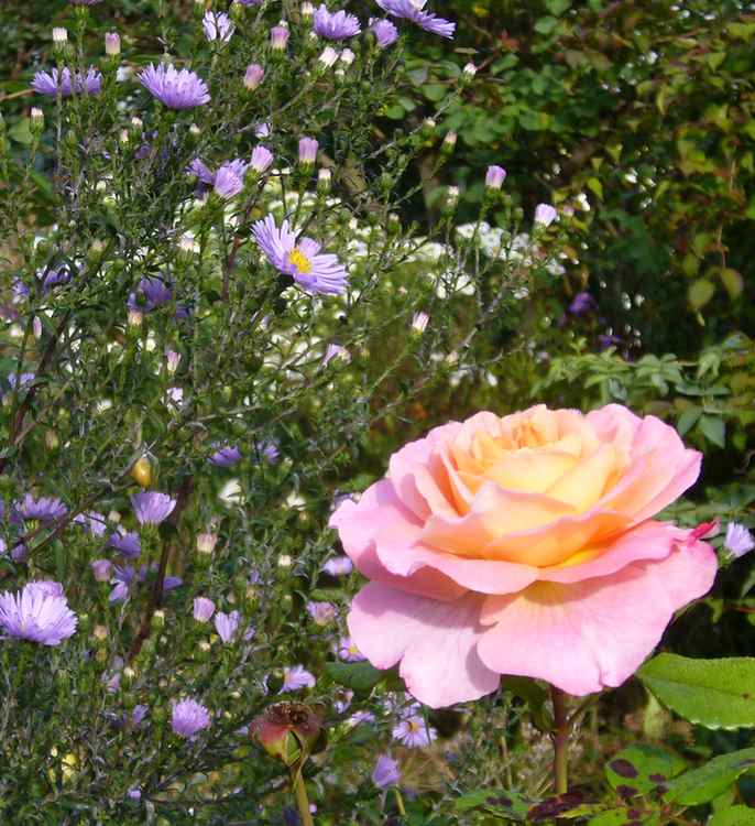 Letzte Blüte von "Augusta Louise" mit mannshohem Sämling von Aster laevis.