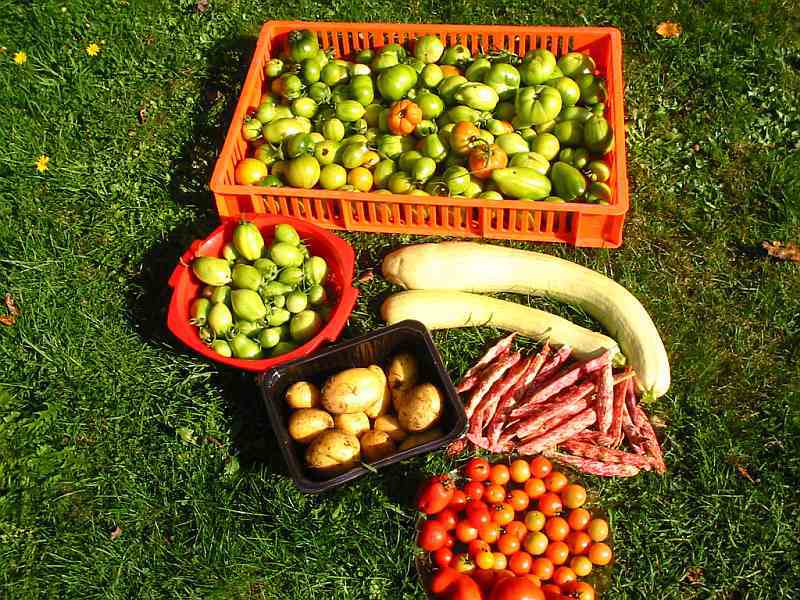 Reichlich noch grüne Tomaten zum Nachreifen, allmählich kommt die Braunfäule und die nächsten Tage hab ich wenig Zeit. Ich hoffe, die meisten werden noch rot. Ein paar rote gabs aber auch.Die ersten Mulchversuch (Wiese zu Kartoffelacker)-Kartoffeln, angenehm große und schöne Kartöffelchen, das Kraut ist noch gut grün, ich hoffe auf mehr.Noch ein paar große Zucchinis, die weiße von Franchi war ein absoluter Erfolg, selten hatte ich eine so ertragreiche und auch vom Fruchtfleisch her feste, aber von der Schale her zarte Zucchini.Ein paar Spatzeneierstangenbohnen, aus Kernen, Tomaten, Kartoffeln, Zucchini und noch vorhandenen Gurken will ich morgen einen Salat machen.Und einen Eimer Brombeeren und Himbeeren, der schon im Marmeladentopf wartet.