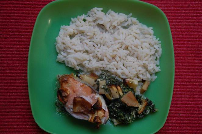 ;DHier gab es Wildlachssteak mit Spinat und Pastinaken aus dem Backofen, dazu etwas Reis.