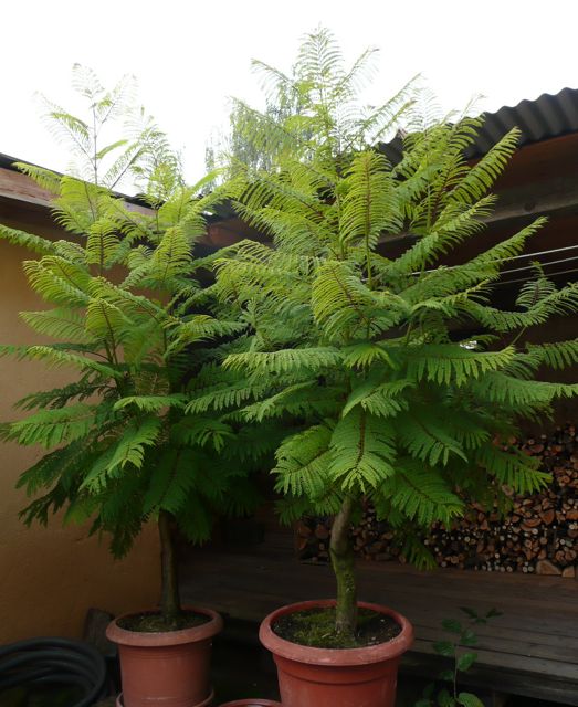 Ich habe zwei aus mitgebrachten Samen gezogene Jacaranden, die mittlerweile fast zwanzig Jahre alt sind. Auf Madagaskar werfen sie während der Trockenzeit das Laub ab - also gieße ich ab November nicht mehr. Sie bleiben draussen, bis wirklich strenger Frost droht. Bis zum Reinräumen haben sie in der Regel alles Laub abgeworfen. Ich schneide sie jährlich vor dem Reinräumen zurück auf ein bis zwei Augen pro Trieb. So bleiben die Kronen kompakt und sie bleiben in einer handhabbaren (Kübel-)Größe. Drinnen stehen sie frostfrei, kalt und dunkel - da sie kein Laub haben, brauchen sie auch kein Licht. Gegossen werden sie im Winter kaum - nur grad so, dass der Ballen nicht völlig durchtrocknet.