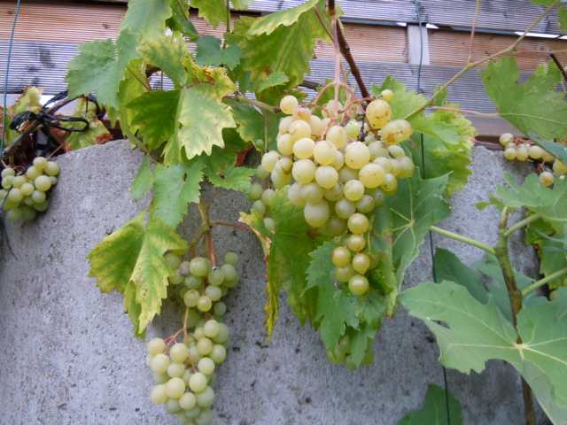Die "Memme" Arkadia. Schmeckt langsam ein bißchen nach etwas. Aber nicht viel. Viele geplatzte Beeren. Diese Rebe steht frei an einem Stickel als Bäumchen.