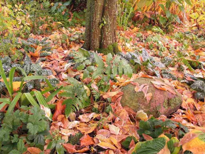 Bilder aus dem Waldgarten - etablierte Pflanzungen.Das Lindenbeet, deutlich mehr Schatten. Vor 2Jahren angelegt.Hepatica, Helleborus, Geranium, Kletterhortensie, Hosta's, 2 Rhodos, Buschwindröschen und schneeglöckchen.Der Boden Kräftig mit Laubhumus aufgebessert.