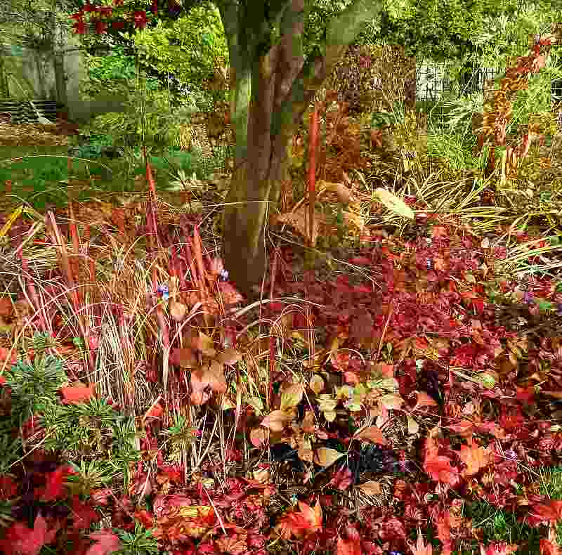 Hausgeist, was für ein herrlicher Gartenteppich (#1426). Ute, ein ausgesucht schönes Foto. Toll!Eupatorium rugosum 'Chocolate' blüht bereits seit längerer Zeit. Rechts Fothergilla major.
