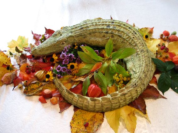 Das Krokodil ist eigentlich ein Adventskranz. Aber ist auch im Herbst zu gebrauchen.Vielleicht leben dann die Herbsthimbeeren die dazwischen gestreut wurden länger. ;)Zu Essen gibt es kein Fleisch, aber von einer Kürbisuppe bis zu Pizzen Kuchen und sonst so allerlei.Vielleicht gibts ja noch eine Gelegenheit zwischendurch mal ein Foto zu machen.