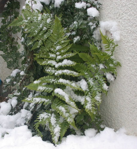 Auch eine dickere Schneedecke nehmen sie nicht übel, wie hier Polystichum setiferum “Plumosum Bevis”.