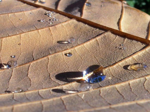 hier ein Tropfen, der durch die Spiegelung fast unsichtbar wird.