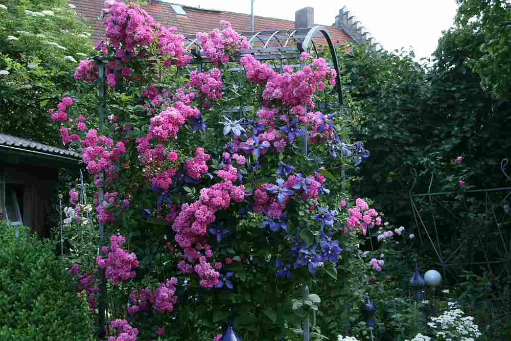 sieht wirklich genial aus...und die durandii hat einen herrlichen blauton, der einfach effektvoll ist, als staudenclematis hervorragend für rosen geeignet, da sie keine Massen an "Todholz" produziert im Laufe der Jahre, sondern schlicht jährlich oberirdisch abstirbt...das lässt sich vermutlich recht leicht dann im Herbst/Frühling aus der Rose ziehen, ehe die Clematis neu austreibt....sie steht bei Dir herrlich frei...im Eingangsbereich- Durchgang/ Kleider-Haut-Reißnähe wollte ich diese Kombi aber wohl eher nicht haben