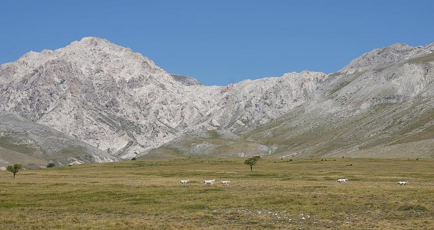 Herdenschutzhunde wie die auf dem Bild von Eva sind ja meistens nur dazu da, Wölfe abzuschrecken. Sie hüten auch keineswegs die Schafe, sondern laufen einfach so mit. Wer schon mal in den Abruzzen war, wird ihnen begegnet sein; sie laufen tagsüber in kleinen Rudeln völlig alleine durch die menschenleere Landschaft und bewachen meist nur nachts ihre Schafherden. Sie sind recht selbstständig und das wäre wohl auch ein Problem in D, wenn Schutzhunde tagsüber herumstreifen - würde wohl mehr stören als die Wölfe.Angehängt noch ein Bild vom Campo Imperatore. Das kleine Weiße im Vordergrund sind Pastore Abruzzese