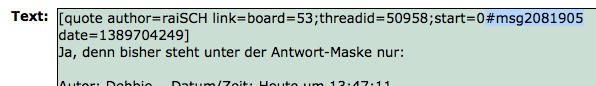 Kurze Frage: Wo genau siehst Du das?In meinem "Antwort mit Zitat"-Fenster sehe ich Folgendes (und kann entsprechend die ID herauskopieren)Ja, denn bisher steht unter der Antwort-Maske nur:Autor: Debbie Datum/Zeit: Heute um 13:47:11