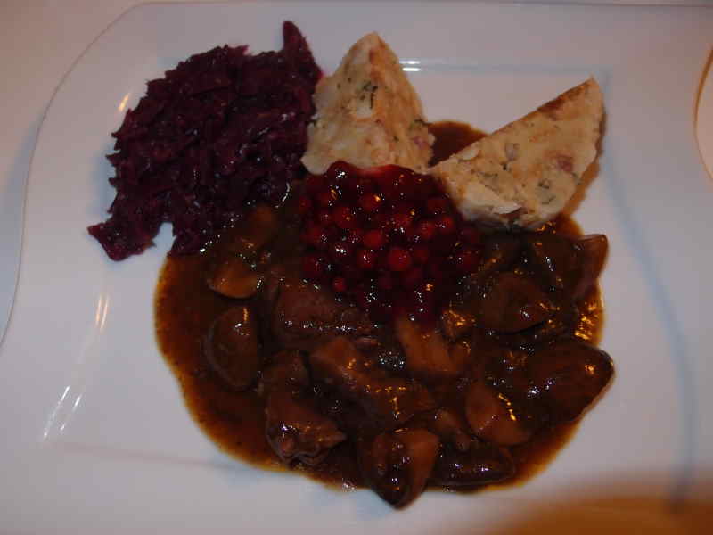 gestern gabs hirschgulasch mit pilzen, semmelknödel, rotkraut und für mich ordentlich preiselbeeren drüber.