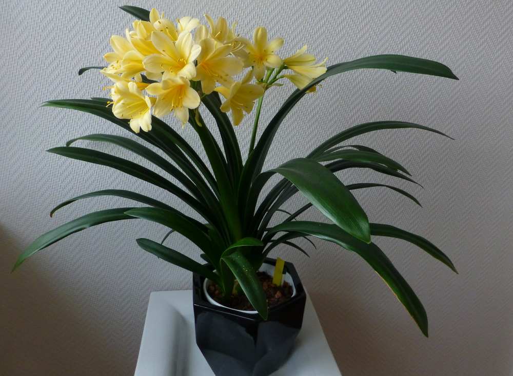 . Und bei der Gelegenheit kann man dann auch eventuell vorhandene Schädlinge entdecken.Als ich die oben gezeigte gelbe Klivie vor ca. vier Wochen aus diesem kalten Raum geholt habe, wurde der Staub mit einem trockenen Tuch abgewischt. Mehr mache ich nicht mit ihnen. Ich habe gelesen, dass man bei Klivien auf gar keinen Fall irgendwelche Blattglanzmittel verwenden soll, da sie diese wohl nicht vertragen.Inken,wenn man Klivien aus Samen heranzieht, muss man leider viel Geduld aufbringen. In diesem Frühjahr werden bei mir einige aus Samen gezogene Sämlinge blühen. Ich kann es kaum erwarten. Hoffentlich sind auch ein paar schöne Blüten dabei. Ich mag aber auch sehr gern orange blühende Klivien in diesen eher trüben Wintertagen. Noch als Ergänzung zum Foto der gelben Klivie, damit man eine bessere Vorstellung von den Größenverhältnissen hat: Der Durchmesser der großen Dolde beträgt 22 cm und der Blütendurchmesser 7,5 cm. Der zweite Blütenstand hat erheblich weniger Blüten, wie man gut sehen kann.Viele GrüßeElke
