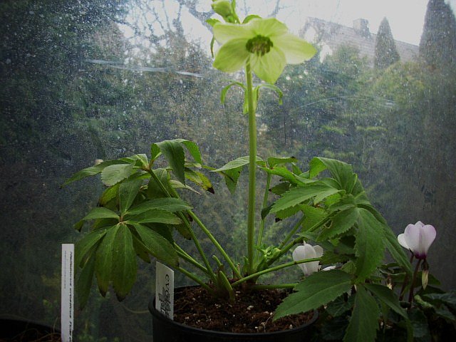 irgendwie hat mir ja die "vergilbende" niger mit den gelben nektarien, die axel gezeigt hat, keine ruhe gelassen. und ich hab gestern und heute überall die tische mit den meristemvermehrten mal genauer unter die lupe genommen. beim letzten gärtner bin ich fündig geworden: helleborus niger "johanna". (eingetragenes warenzeichen)ist zwar nicht die gleiche wie auf axels bild, aber gilbt auch schön. sie hat ein grünes auge und gelbgrüne nektarien. das gelb ist fürs auge intensiver, als es die kamera wiedergibt.die ist in jedem fall im labor entstanden und wird dort auch vermehrt. nehme also das "besondere" zurück. vermutlich werden wir in zukunft damit überschwemmt werden.aber sie ist schön und so hab ich halt meine abneigung gegen die meristemvermehrten hellis mal unterdrückt.