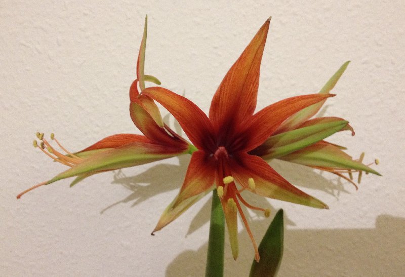 die Rittersternkultur hatte ich ja beinahe fast ganz aufgegeben und nur zwei Töpfe mit bemerkenswerten Exemplaren mit gesundem Laub, die ich noch nie habe blühen sehen, aufgehoben. Etwas radikales Kulturverfahren. Das ganze Jahr drinnen und im Sommer auf der Südostseite in völliger Trockenheit auf der Fensterbank. Dann in Komposterde getopft und siehe da, zwei Blütentriebe. Einer blüht gerade.