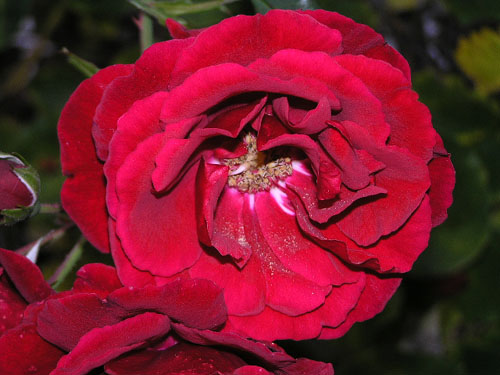 Wir haben unseren Garten schon mit dieser roten Kletterrose übernommen. Sie muss also schon etwas älter sein. Ich schätze mal vor 1980, da danach nichts mehr im Garten gemacht wurde. Die Rose hat über 5 m lange dicke starre kräftige Triebe und blüht in Büscheln. Von unten her ist sie kaum verzweigt. Das Rot der Blüten kann man schwer fotografieren. Ich empfinde es als schön samtig und überhaupt nicht grell, ganz dunkel ist es allerdings auch nicht, mit leichtem Duft. Im Moment bildet sie runde, dicke, orange Hagebutten aus.Es wäre schön, wenn ihr sie bestimmen könntet