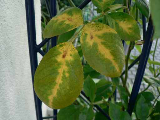 Meine 'Golden Showers', die jetzt das 2. Jahr im Topf steht, hat ab Ende Juli solche Blätter bekommen. Was fehlt ihr?