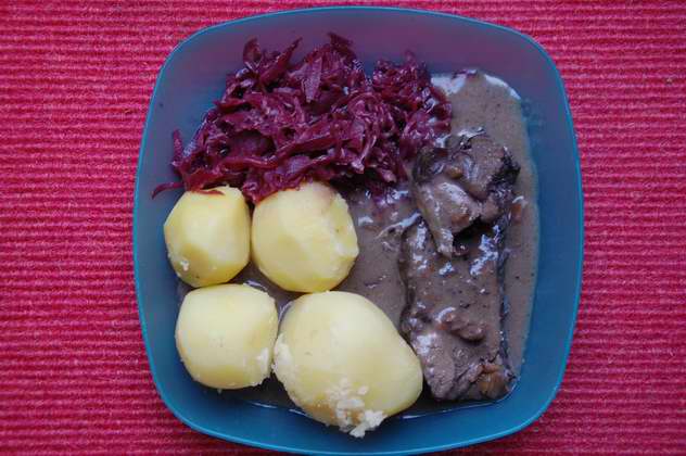 Montags - Reste vom Sonntag: Rehkeule (aus brandenburgischen Wäldern) mit Kartoffeln und Rotkohl. Vom gestrigen Wirsingkohl und den Klößen war nichts mehr übrig