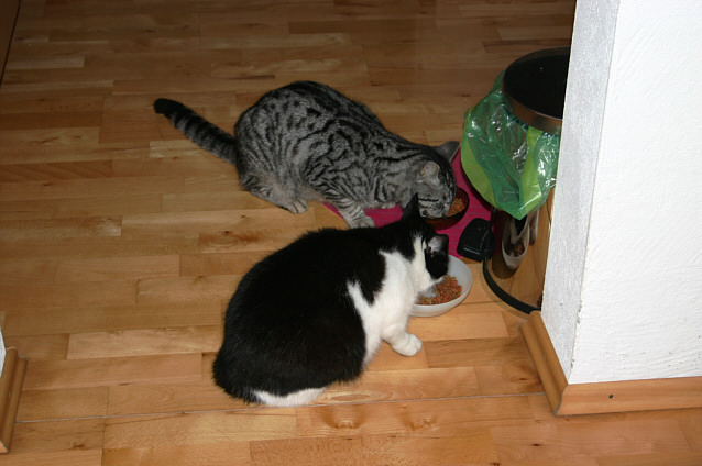 Einen schönen guten Morgen,wir hatten nachts Regen. jetzt versucht die Sonne durch die Wolken zu kriegen, wir haben + 7 Grad, leichten Westwind. Mini liegt immer noch in seinem Bettchen. Um 21.30 Uhr waren beide gestern da, Mini im Bett, Thommy an der Haustüre. Ersterer kam eine warme Milch (es war ziemlich kalt um die Zeit), letzterer ein warmes Essen.Mini schläft in seinem Bettchen, nachdem er um 08.00 Uhr gefrühstückt hat, Milch und sein Trockenfutter. Thommy kam erst um 10.00 Uhr. Und jetzt sind noch beide draussen.Inzwischen ist Thommy wieder unterwegs, Mini liegt in seinem Bettchen. Gerade haben wir so gelacht... GG mußte husten - so richtig laut. Mini fand offenbar es höre sich an wie Bellen und sauste aus seinem Bettchen, hinter die Aukuba an der Nachbarhauswand und guckte erst mal betröppelt. Wir haben dann auf ihn eingeredet und er kam vorsichtig vor und ging wieder ins Bett. Brav so, so hat er sich schnell erholt, der Kleine.VENGA, Du hast schon recht. Andererseits dürfte es momentan fast keine unkastrierten Katzen und Kater hier mehr geben. Früher tauchten ständig mal junge Katzen auf. Seit vielleicht zwei Jahren ist das nicht so. Nur letztes Jahr war mal ein junger Kater da, der Mini wirklich wie aus dem Gesicht geschnitten war.Der kam aber nur einmal, war auch recht zutraulich. Gesehen haben wir ihn hier nicht mehr.Hier treiben sich momentan nur Thommy und Mini rum und die kastrierten Damen Muschi und Stella.
