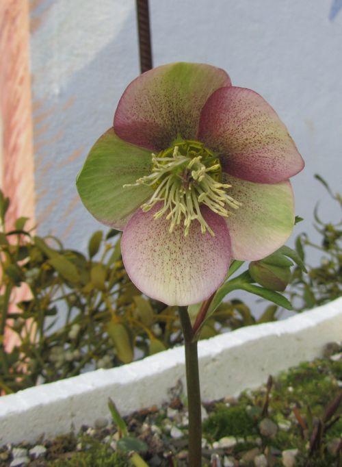 Das Laub wird mit den Jahren immer feiner geschlitzt bei dem Typ. Nur meine Ableger sind sauer und hat wieder jugendlicheres Laub.In normalen Wintern sind sie aber nicht grün. Die Blüten sind von diesem bunten Teil genauso groß wie die grünen. Ist aber eine Erstblüte. Ich werde sie nach der Saison umpflanzen.