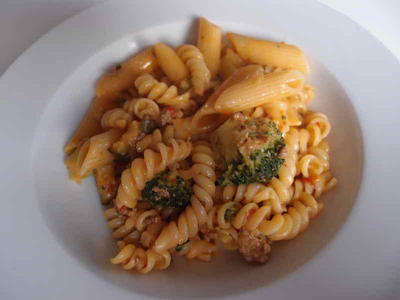 und gestern reste. rest ajvarhacksuppe aus dem tk, mit restbrokkoli aus dem tk. das ganze dann als nudelsoße mit restaufgebrauchten nudelpäckchen.