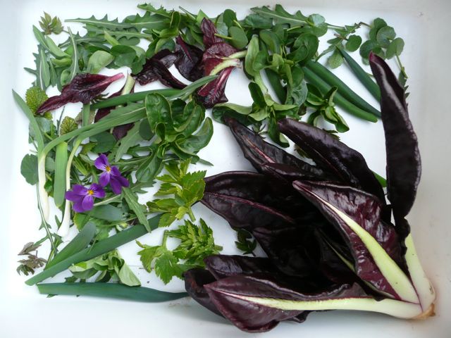 Für einen Kräuterquark ersten Austrieb von Knoblauch, Blättchen von Russischem Lauch, Winterheckzwiebeln, Scharbockskraut, Giersch, Rucola, Rapunzel, Roten Beten, Kohlrabi, Stangensellerie, Zitronenmelisse, Spitzwegerich und einen Radicchio di Treviso.