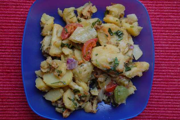 .Lieschen, was ist das Gelbe in der Blutwurst?Hier gab es bunte Gemüse-Kartoffel-Pfanne mit Gurke, Tomate, Zwiebel, Ruccola, Thymian ...