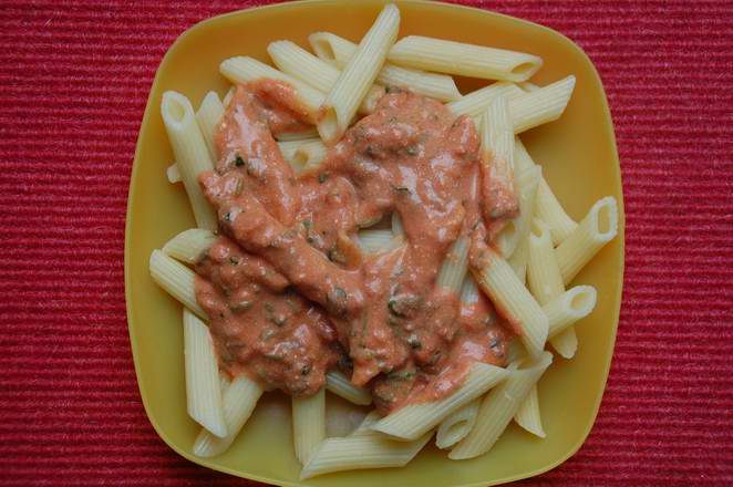 Hier gab es Penne mit Tomaten-Frischkäse-Ruccola-Soße.