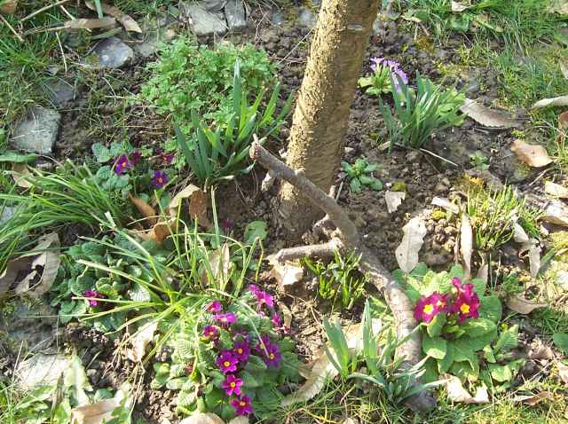 Da habe ich unter der Sauerkirsche ein Beet mit Primeln gehabt, jetzt muß es sich wieder neu aufbauen. Die Narzissen hatte der Winter 2012 auch dahin gerafft.