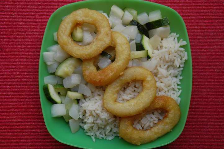 Es gab Reis mit Tintenfischringen, Mairüben und Zucchini.