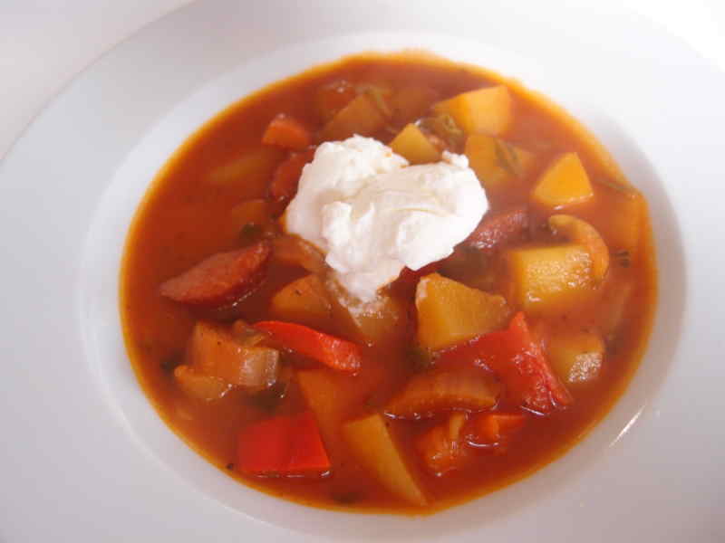 und heute einen tomatigen eintopf mit kabanossi, kartoffel, mangoldstielen und paprikawürfeln