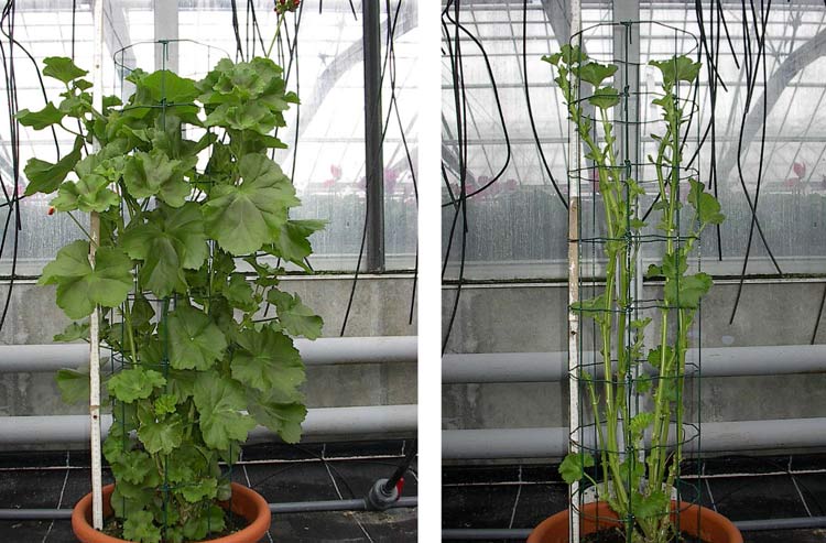 Da das Tehma ja scheinbar noch aktuell ist, geb ich auch mal meinen Senf dazu:Als erstes mal ein paar Zeilen aus 'Gärtnerischer Pflanzenbau' UTB:Wirksoffe:Neben den anorganischen Nährsoffen (Salze, Nährelemente, Dünger...) benötigen alle höheren Pflanzen für ihre Entwicklung organische Komponenten.Diese Stoffe sind an der Steuerung von Wachstum und Entwicklung beteiligt. Sie werden allg. unter der Bezeichnung Wirkstoffe zusammengefasst.Neben diesen von den Pflanzen selbst gebildeten Stoffen gibt es auch eine Reihe von pflanzenfremden Substanzen, mit denen man in ähnlicher Weise in die Entwicklungsprozesse eingreifen und das Wachstum variieren kann.Sie haben zum Teil große Bedeutung in der Praxis.WirkstoffgruppenInnerhalb der Wirkstoffgruppen werden neben Vitaminen, Antibiotika usw. eine Reihe von Substanzen unter dem Begriff Wachstumsregulatoren zusammngefasstHierunter werden diejenigen organischen Substanzen verstanden, die Wachstum und/oder Entwicklung regulieren können.WachstumsregulatorenDie Unterteilung der Wachstumsregulatoren wird nach drei Kriterien vorgenommen.1. Unterscheidet man nach ihrer Wirkungsrichtung in Wachstums- und Hemmstoffe.2. Wird unterschieden zwischen Stoffen, die von der Pflanze selbst nicht syntetisiert werden, den pflanzenfremden Wachstumsregulatoren, und solchen, die in der Pflanze natürlicherweise vorkommen.Die natürlich vorkommenden Wachstumsregulatoren werden in Anlehnung an die Medizin als Phytohormone bezeichnet, weils sie ähnlich wie die tierischen Hormone für die Koordinierung zwischen einzelnen Geweben innerhalb des Organismus verantwortlich sind.Sie haben stets ein breites Wirkungsspektrum, steuern also immer mehrere Prozesse.Sie kommen praktisch in allen Pflanzenorganen und allen Pflanzengruppen vor.3. Eine dritte Einteilung wird nach der chemischen Struktur vorgenommen.Man unterscheidet;AuxineGibberellineCytokinineAbscisine (ABS).Die ersten drei stellen Wuchstoffe dar, die Abscisine pflanzeneigene Hemmstoffe. Als zweites ein paar Bilder von 'gestreckten' Pelargonien, mitten im Produktionsprozess, sowie einen Auszug aus der dazugehörigen Kulturbeschreibung:Auszug aus Kulturbeschreibung 'Säulengeranien'"....Die Lieferung der Jungpflanzen erfolgt in Woche 8. Gepflanzt wird manuell: [...]Ab KW 16 werden aus dem Bestand an ,Beet-und-Balkon’ Ware geeignete, besonders verzweigte, stehende Pflanzen der Art P. zonale für die Säulenproduktion ausgewählt und separiert.Die Pflanzung in Töpfe mit einem Durchmesser von 35 bzw. 40 cm findet in KW26 [...] statt. Hierzu werden in die Töpfe Drahtgeflechte gestellt und die Töpfe zu ¾ mit Erde gefüllt. Die Geflechte, [...] können als Röhren oder offene Kegel beschrieben werden.Sie dienen der Stabilisierung und Formgebung der Geraniensäulen und bestehen aus ummanteltem Maschendraht mit einer Maschenweite von etwa 15 cm. Diese Weite ermöglicht ein uneingeschränktes Durchgreifen und erlaubt somit einfaches Topfen und Arbeiten direkt an der Pflanzen.Innerhalb des Drahtgeflechts wird jeweils eine bereits gut verzweigte Geranie gesetzt und der Topf mit Substrat aufgefüllt. Hormonelle Behandlung a] StreckungsbehandlungUm ein gestrecktes Wachstum zu erzeugen werden die Pflanzen mit Gibberellinsäure, GA3 behandelt.Gibberelinsäure bewirkt ein allgemeines Streckungswachstum vor allem der Internodien. Bei Geranien speziell äußert sich eine Gibberellinbehandling in einem enormen Steckungswachstum, sowohl der Internodien als auch der Blattstiele, die leicht eine Länge von über 15 cm erreichen. Auch die Blätter erreichen Durchmesser von über 12 cm. Die Blüte zeigt sich, mit Ausnahme eines überlangen Stiels normal und weder deformiert, verfärbt noch auffällig in ihrer Größe verändert.In der Gärtnerei [...] erfolgt die Gibberellinbehandlung zwei Mal, im Abstand von 14 Tagen in den KW 29 und 31. Da das kristalline Gibberellin nicht wasserlöslich ist, wird es in ausreichend medizinischem Alkohohl gelöst und mit Wasser vermischt über die Pflanzen ggespritzt; Die Konzentration beträgt 0,02%.Der Effekt ist nach ca. 3 Wochen deutlich zu erkennen. Nun wachsen die anfangs etwa 15 cm großen Jungpflanzen innerhalb von 10-12 Wochen zu über 1 m großen ‚Säulenrohpflanzen’, ein ständiges Ausputzen und Formieren, sowie ausreichende Nährstoffzufuhr vorausgesetzt. b] StauchungUm den Prozess des gesteigerten Steckungs- und Größenwachstums zu unterbrechen werden die Pflanzen nach ca. 24 Wochen des Wachstums, um KW50, gestaucht. Dazu werden die sie mit 0,1%iger Lösung CCC [Cycocel, Wirkstoff Chlormequat-chlorid, 720g/L] eingenebelt; dies wird nach ca. 7 Wochen wiederholt.Das Stauchen bewirkt eine fast sofortige Stoppung des Längenwachstums. Die Blätter nehmen ihre artgerechte Größe an und geben der Pflanze somit ein natürlicheres Erscheinungsbild. Auch verfestigen sich nun die durch die Gibberellinbehandlung gestreckten Triebe und der Austrieb von Seitentrieben wird gefördert ZIMMER et al. [1991].Die Wirkung der Behandlung ist nach etwa einer Woche sichtbar.Manuelle KulturmaßnahmenNach dem Pflanzen in den Endtopf und den Gibberellingaben im Juli wachsen die Pflanzen bis etwa Mitte Dezember. In dieser Zeit müssen sie ca. 3-4 Mal ausgeputzt werden.Dies dient einerseits der präventiven Schädlingsbekämpfung - durch Entfernen der meisten übergroßen Blätter wird eine freie Luftzirkulation ermöglicht und dadurch einem Befall mit Botrytis und tierischen Schädlingen vorgebeugt - andererseits werden die Pflanzen zu einer Säule geformt.Das Ausputzen und Formieren ist ein relativ langwieriger Vorgang; in einer Stunde können, je nach Entwicklungsstand, etwa 10 Pflanzen bearbeitet werden.Dazu werden bei den inkl. Topf bis zu 120 cm hohen Pflanzen die meisten Blätter entfernt; ein geübtes Auge erkennt welche Blätter die Luftzirkulation oder den Austrieb behindern und welche für die Assimilation benötigt werden. Das Entfernen erfolgt durch Abknicken der Stiele an einer Art ‚Sollbru