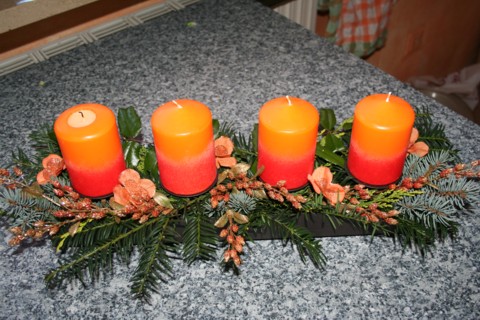 Guten Morgen,sag mal wo hast du diese schönen Kerzen her? Der orange Küchenkranz gefällt mir auch sehr gut!Hier meine Kreation in Dunkelrot! Ist nur ein Ausschnittbild aber das einzige das die Farben gut bringt!LGBachfrosch