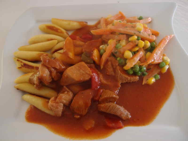 und gestern puten- und paprikawürfel in paprikasoße, schupfnudeln und gemüse