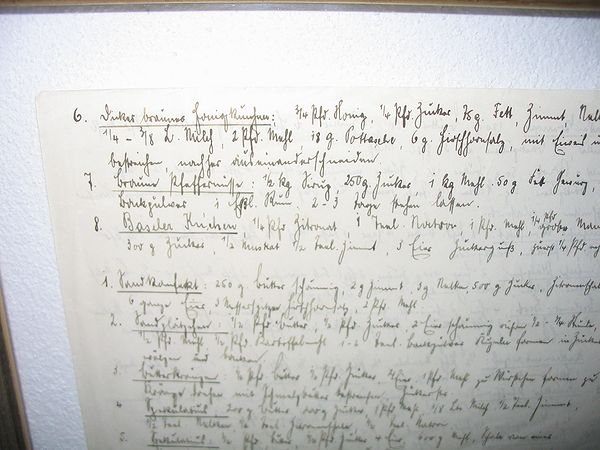 Bei uns hatte der Urgroßvater die Familienrezepte gesammelt und mit feiner Schrift aufgezeichnet. Wir haben seine Arbeit nachträglich geehrt, in dem wir dieses Blatt beidseitig mit Glas gerahmt haben. Das "Bild" hängt zur stetigen Erinnerung in unserer Küche.