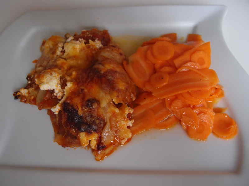 Süßkartoffel-Gemüseauflauf mit Schafskäse und Salat.