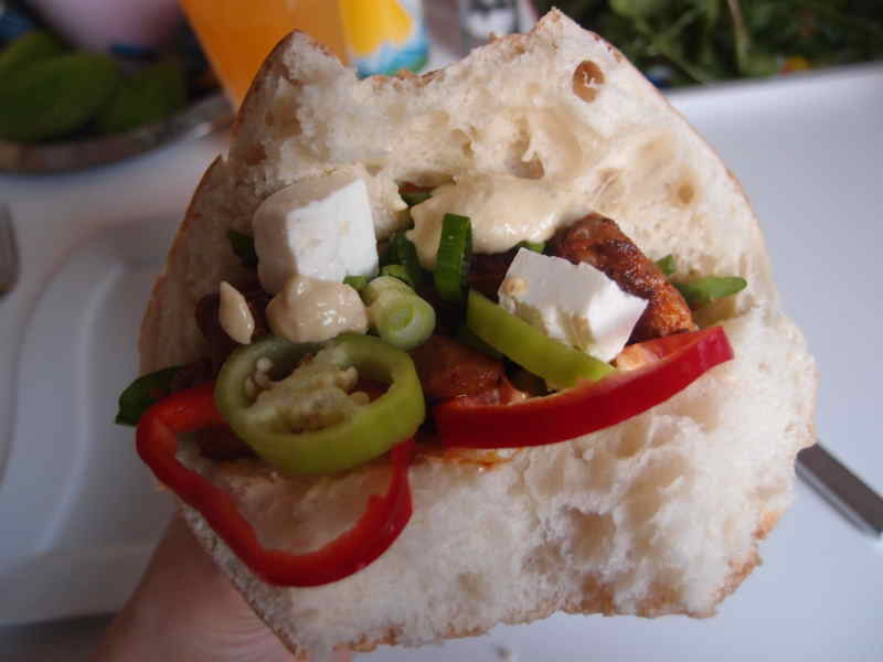 und heute fladenbrot gefüllt mit marinierten putenwürfeln, grünzeugs, schafskäse und einem auberginendip