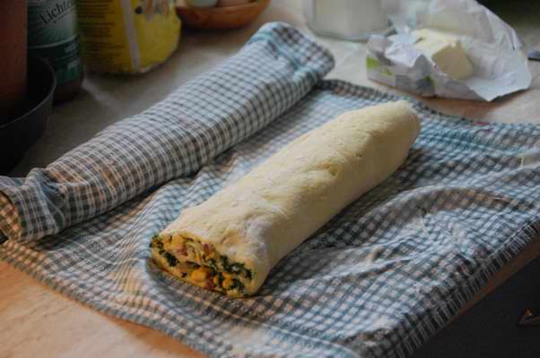 Und hier gab es Kartoffelroulade mit Knoblauchraukenschnipseln. Der Teig ist aus gekochten Kartoffeln, Ei und Mehl. Die Füllung besteht aus Frischkäse, Zwiebeln, Spinat, Mais, Schinkenwürfeln und geriebenem Käse.