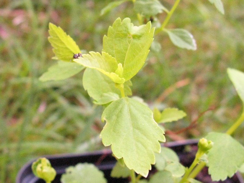 Sehr unscheinbar, jedoch niedlich...Spiraea japonica 'Crispa', ein Zwerg mit schmalem, leicht gedrehtem Laub und gesägten rötlichen Blatträndern.