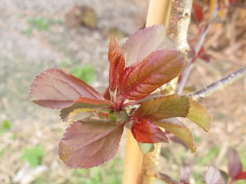 Hier der Austrieb meines Unikums an kurzen Seitenzweigen. Das Laub vergrünt im Laufe des Sommers leicht wie bei 'Eley'.Der jetzt dreijährige Heister scheint recht starkwüchsig zu sein und hat in einem 3 L Topf schon die stattliche Höhe von mindestens 1,6 Meter.An der Triebspitze ist das Laub länglich und leicht gelappt und bezeichnender Weise auch über Winter im Freiland grün geblieben. Die Rinde ist fast schwarz und deutlich gepunktet.Vielleicht lässt sich daraus ja die Abstammung dieses Spontansämlings herleiten?