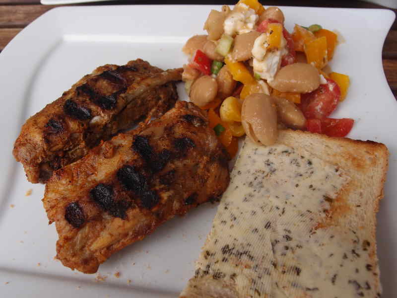 wir hatten gestern spareribs, dazu salat aus dicke weißen bohnen, paprika, tomate, schafskäse und bohnenkraut. und für die kräuterbutterliebhaberin noch eine scheibe brot mit selbiger dazu