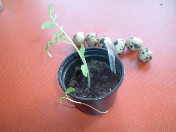 Hier habe ich noch eine weitere Kuriosität, aus dem Boden des Tomatentopfes wächst ein unbekanntes Pflänzchen, wahrscheinlich ein "Unkraut".