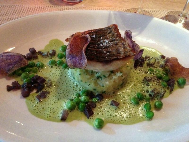 danach meeräsche auf stampfkartoffeln, dazu blaue kartoffeln und erbsen