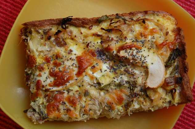 Heute gab es Sauerkrautquiche mit Vollkornteig und Zwiebel, Apfel, Speck, Knoblauchrauke, Oregano, Sauerkraut, Sahne, Käse, Ei.