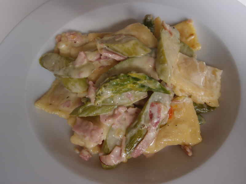 Es gab Fusilli mit Tomatensoße und Knoblauchsraukenblüten (bevor es sich zu stark versamt