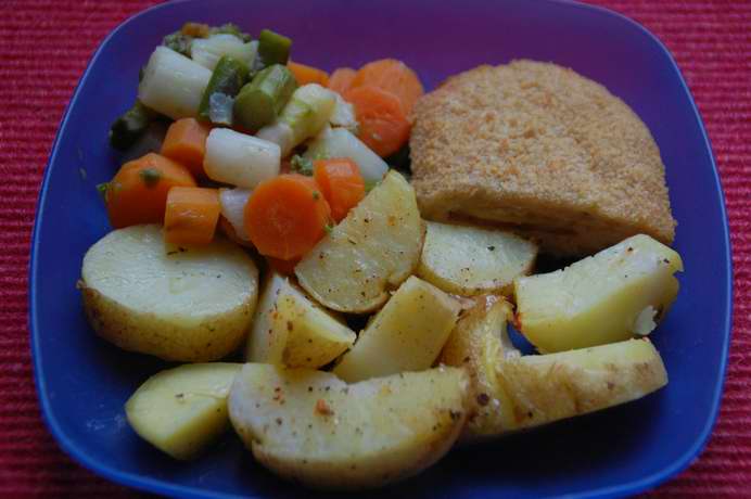 . Den schnapp ich mir!Hier gab es Reste vom Sonntag: Cordon bleu (Fertigprodukt) mit Backofenkartoffeln und Möhren-Spargel-Gemüse.