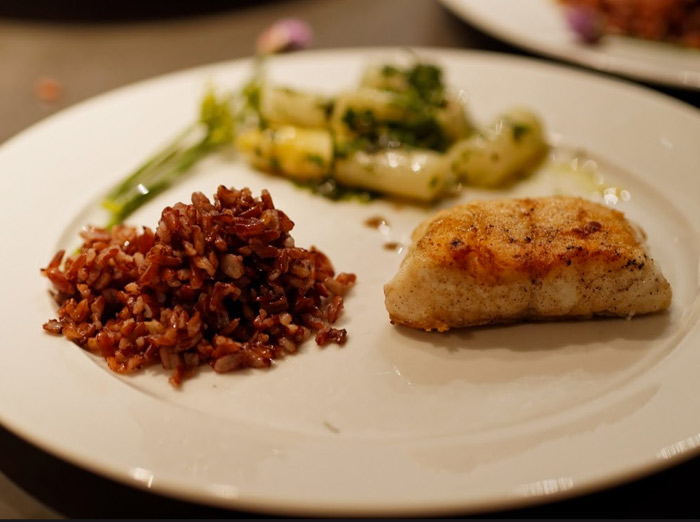 Kleiner Fischgang mit Zander, Spargel in frischen Kräutern geschwenkt und dazu roten italienischem Reis.Den Hauptgang Lamm mit Wildkräuterkartoffelpüree und das Dessert Panna cotta haben wir leider dann wieder vergessen zu fotografieren.