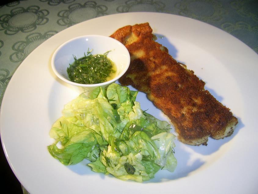 @Quendula: Deine Eierkuchen mit dem ungeplanten Salat sehen superlecker aus.@martina: Das klingt deutlich nach Nachkochen.Bei uns gab es am Montag gebratenes Kabeljaufilet mit Grünem Salat und einer leckeren Senf-Dill-Sauce.