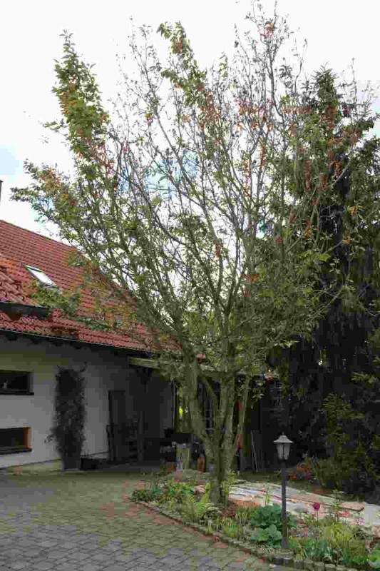 Hallo zusammen,ich habe im Vorgarten eine Zierkirsche stehen, wurde vom Vorbesitzer gepflanzt. Ich vermute es ist eine 'Kanzan'. Allerdings sieht sie schrecklich aus, mein Verdacht ist Monilia. Soweit ich gelesen haben, kann es Feuerbrand bei der Kirsche ja zum Glück nicht sein. Kann man Monilia bestätigen?Zwischen der Kirsche und der Fichte stand noch eine Fichte, die kam diesen Winter weg. Deshalb hoffe ich mal, dass der offenere Stand etwas bringt. Aber von alleine wird sie wohl nicht gesunden, oder? Laut dem was ich gelesen habe, sollen betroffene Triebe ca. 20cm ins gesunde Holz geschnitten werden. Aber macht das bei einer Zierkirsche Sinn? Wie sieht die denn danach aus? Ihr seht, ich habe noch Hoffnung dass es auch anders geht.Hier noch ein paar Bilder, damit ihr seht was ich meine.Gesamtbaum:
